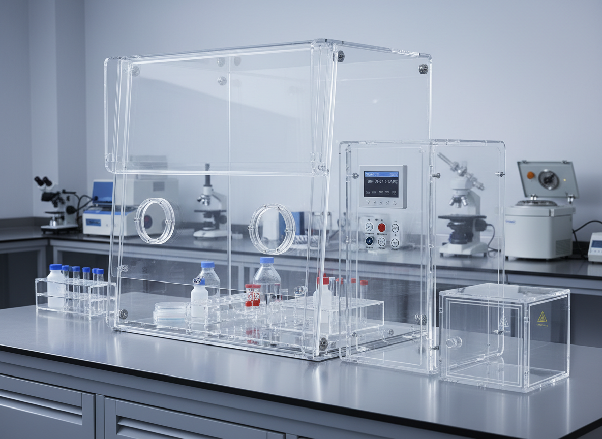 Trabajamos con acero inoxidable AISI 304 y 316L, con acabados sanitarios y procesos de soldadura y pulido que evitan puntos de contaminación. Usamos acrílicos y policarbonatos de grado técnico para barreras de protección, pantallas de aislamiento y encapsulados de equipos.